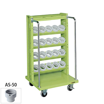幅670mmの4段+最上段トレー付きツーリングワゴン。ホルダーはAS-50型、キャスターは四輪自在。本体カラーはグリーン。